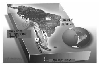 3、单选题 北京时间2014年4月2日7时26分25秒,智利西北部附近海域发生8. 2级地震,海浪约高6.9英尺(约合2. 1米)。此次震中位于智利北部城市伊基克西北方向99公里,距离智利北部海岸83公里。结合图回答下列各题。