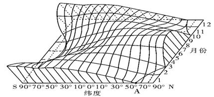 4、综合题 (8分)该图为“各月太阳辐射量随纬度分布图”,读图回答下列各题。