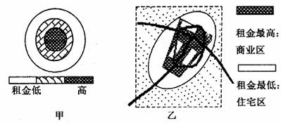 ⑴ 甲图反映的是?对城市土地租金和城市功能分区的影响;乙图反映的是城市土地租金的变化受?的影响。