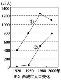 (3)图2的①、②两线中,反映G城人口变化特点的是____________线。这说明20世纪80年代以来,G城的人口变化特点是________________________________,其原因是存在_________________________、_____________________________等社会经济问题。