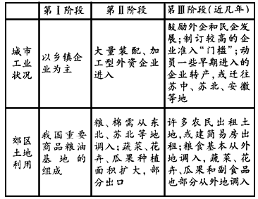 材料一:下表为长江三角洲地区某城市及其郊区不同发展阶段的信息变化表。