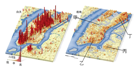 ①有铁路线分布,交通发达 ②经济区位条件优越 ③城市人口密集?④基础设施不完善 A.①②④ B.①②③ C.②③④ D.①③④ 2、单选题 下图反映的是纽约市部分地区人口的白天和夜晚分布情况,读图回答下列问题 。 |