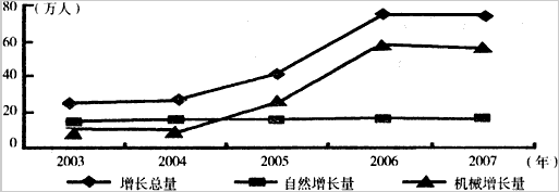 A.加剧空气污染 B.扩大消费市场 C.缓解市内交通压力 D.出现逆城市化现象 参考答案: 本题解析: 本题难度:一般 2、单选题 读“我国东部沿海某省2003~2007年人口增长情况图”(下图所示),完成1—2题。