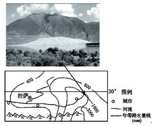 3、单选题 下图景观名为“佛掌沙丘”,位于雅鲁藏布江北岸的山麓地带。每当枯水期时,其附近河流中常有河沙出露,经强风年复一年地吹送,逐渐在河岸上形成了这一巨大、突兀的沙丘。据图文资料回答题。
