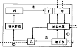 5、单选题 下图为城市水循环示意图,甲、乙、丙、丁表示用水终端、污处理厂、大气水、自来水厂,读图回答1—2题。
