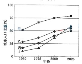 5、单选题 下图中四条折线示意中国、全世界、发展中国家和发达国家的城市化水平及其变化趋势。读图完成问题。