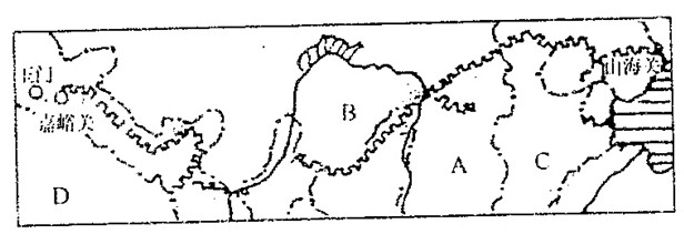 A.A地位于东部沿海,B地位于西部内陆? B.A地位于东部沿海,B地位于中部地区 C.A地位于西部内陆,B地位于东部内陆? D.A地位于中部地区,B地位于西部內陆 参考答案: 本题解析: 本题难度:简单 3、单选题 有关这条分界线南北两侧的区域差异,叙述正确的是(?) 参考答案:B 本题解析:秦岭-淮河一线是我国东部季风区内华北暖温带湿润半湿润地区和华中亚热带湿润地区的分界线,也是我国800mm年降水量等值线和一月份0℃等温线大致经过的地方。该线以北的年降水量小于800mm,属于半湿润、半干旱的暖温带和中温带地区,耕地类型以旱地为主,主要粮食作物既有冬小麦,也有春小麦,东北地区的典型植被以针叶林和针阔叶混交林以及草甸草原为特色,华北为落叶阔叶林。该线以南的年降水量大于800mm,属于湿润的亚热带、热带地区,耕地类型以水田为主,主要油料作物是油菜,华中地区的典型植被为常绿阔叶林,华南为热带季雨林。造成秦岭—淮河一线南北两侧区域差异的主要原因是由于纬度位置的不同,而导致气候出现差异。 本题难度:简单 4、单选题 读“万里长城示意图”,完成题。 |