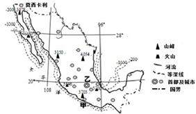 本题解析:本题考查世界区域地理。(1)直接读图判断,该地区位于板块交界处,在海洋一侧形成海沟,故等深线密集。(2)直接从表格资料中归纳甲乙两地的气温(气温高低和温差)和降水(总量和季节分配)的相同与不同点。甲乙两地应都为热带草原气候,但由于地形、海陆位置的差异而导致了气候特征的差异。(3)该地区位于美墨边界,承接电子工业主要是由于地理位置优越、地价、住房和劳动力等都较为便宜。(4)该国家为墨西哥,位于热带地区,沿海平原受热带雨林气候影响,终年高温多雨,不利于人类生存,故人口主要集中于内陆高原地区,地势略高,气候较凉爽。