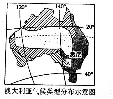 (1)图中沿120°E经线自南向北,气候类型依次是____________、_____________和热带沙漠气候。悉尼的季风气候特征不如上海典型,从悉尼季风气候特征不典型的表现和原因两方而加以说明。(8分)