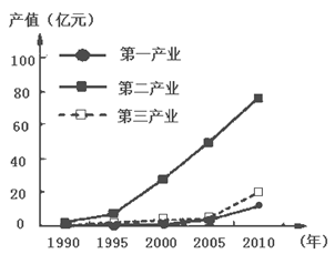 (2)据图说明浙江安吉县竹产业1990—2010年三产产值的变化特点。(6分)