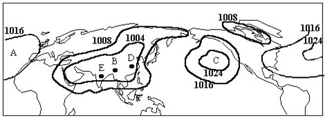 【小题1】据图分析,亚欧大陆形成低压中心,太平洋形成高压中心,说明北半球陆地气温高,所以此图所示的是北半球的夏季。