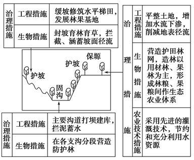 黄土高原地区通过“工程措施、生物措施、农业技术措施”,实行“保塬、护坡、固沟”方针,进行综合治理,取得了显著的成果,具体措施如下图所示: