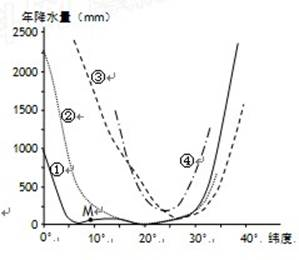 1.表示北美大陆西岸降水状况的是2.M对应的地点年降水量少的主要原因有 A.①曲线 B.②曲线 C.③曲线 D.④曲线 E.纬度低,蒸发旺盛 F.盛行东北信风,水汽含量少 G.终年受副热带高压控制,盛行下沉气流 H.沿岸有寒流流经,降温减湿明显