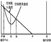 小题1:工业的最大收益区是企业布局的最佳地区,即收入减去费用剩余,结合图示的空间费用曲线和空间收入曲线分布,在收入大于费用的范围内为工业布局的理想区域。