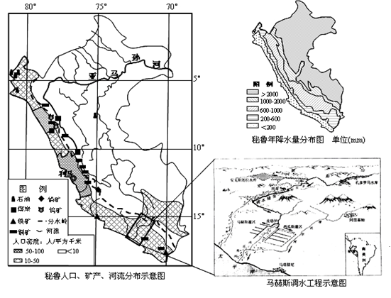 小题1:读“秘鲁年降水量分布图”,描述秘鲁年降水量分布规律。 ? 小题2:秘鲁是一个世界矿产出口大国,矿产资源丰富,集中分布在中部的?山区。说出“秘鲁人口、矿产、河流分布示意图”中洋流流向。说明该洋流对秘鲁自然地理环境的影响。 ? ??。? 小题3:“秘鲁人口、矿产、河流分布示意图”中人口密度小于每平方千米10人的区域主要以热带雨林为主,说明该热带雨林的环境效益。 ? ??。 小题4:秘鲁先后完成了马赫斯及首都利马等多条调水工程。分析秘鲁修建这些调水工程的主要理由,说明对调入区经济发展的有利影响。 ? ? ? ??。