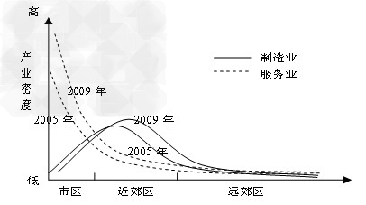2、单选题 下图为“某城市制造业与服务业密度分布图”,读图完成1-2题。