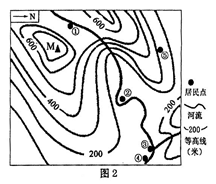 小题2:③居民点位于两河交汇处,最容易发展成为城镇;站在M山顶看不到⑤;根据指向标判断图中干流的流向为从西南流向东北。所以本题选择D选项。