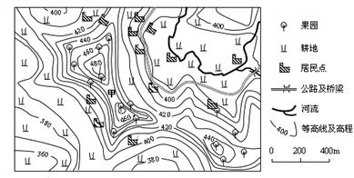 (1)主要考查读图能力,根据等高线判断地形类型为丘陵。甲地地形为鞍部。