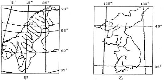 本题解析:本题考查世界地理。 1.根据两半岛的经纬度位置判断,甲表示斯堪的纳维亚半岛,位于欧洲,乙表示朝鲜半岛,位于亚洲,利用经纬度位置判断甲在乙的西北方向。故选B项。 2.根据乙图的河流流向判断,乙半岛的山脉主要位于东北部;乙半岛的地形以高原、山地和平原为主;a所在半岛受冰川作用的影响强,海岸线曲折;图示b所在半岛由南向北逐渐接近亚洲大陆,故大陆性逐渐增强。 3.朝鲜半岛的铁矿资源丰富。