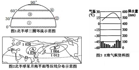 (1)图1中数字表示的气压带或风带的名称① ② ,并在图中画出风带③表示的风向。(3分)