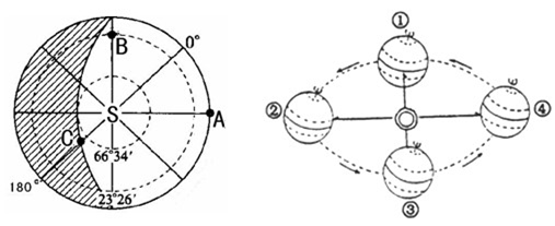 (1)左图为北半球            (节气)日的太阳光照图。此时,C地正处于             (日出、日落),这一天C地的夜长为_____小时。比较A、B、C三地,自转线速度由大到小的排序是    >     >    。