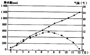 3、单选题 下图示意某地降水量逐月累计曲线(实线)和最热月平均气温与各月平均气温差曲线(虚线)。读图回答以下问题。