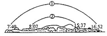5、单选题 下图为我国①②两地某日日出日落(北京时间)示意图,读图回答下列问题。