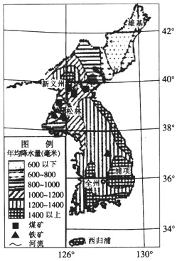 4、综合题 ? 朝鲜半岛的经济发展是东北亚和平稳定的基础之一。半岛南北差异化的区域发展受到了区域地理要素的影响。下图反映了朝鲜半岛的部分地理要素分布状况,下表是图中所示区域四个代表性城市降水量的年内分配表。