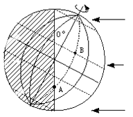 (2)A点在B点的 方向,A点夜长 小时。图中晨昏线是 (晨、昏)线。(6分)