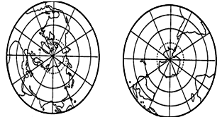 (5)在下面的南北半球图上画出晨昏线,并在夜半球上用斜线画上阴影。(先判断各经线经度)(4分)