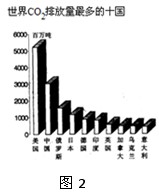 5、综合题  读“世界各大洲工业CO2排放量”示意图1、“世界CO2排放量最多的十国”柱状图2及有关资料,回答问题。