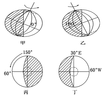 【小题1】“北京之光”点亮时间是0:00,读图分析可以看到,甲图中0°经线的时间是8点,可计算出北京时间是16点,故A错误;乙图中可看到180°经线时间是2点,计算出北京时间是22点,故B错误;丙图中60°W上时间是正午12点,计算出北京时间是24点,即0点,故C正确;丁图可以看到,60°E时间是正午12点中,计算北京时间是16点,故D错误。