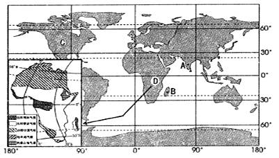 2、综合题 (12分)下图示意全球大洲大洋分布及D大洲气候分布。读图,完成下列各题。