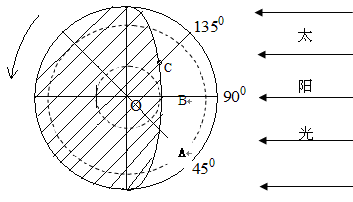 (4) 由地球自转方向可知C点正由白昼进入黑夜,因此是位于昏线上,某地的昼长计算公式为(12-日出时间)*2或者(日落时间-12)*2。由于此时90°E为12点,根据经度每隔15°时差相差一小时以及时区计算东加西减的原则,可知此时C(135°E)的时间为15点,因为C位于昏线上,所以C的日落时间为15点,根据公式(15-12)*2=6,所以其昼长为6小时。