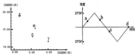 2、单选题  左下图为5月1日四地日出日落时间(北京时间)图,右下图为太阳直射点回归运动示意图。读图完成下列各题。