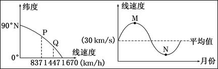 【小题1】根据左图中P、Q两点的地球自转线速度可以算出P点位于60°N,Q点位于30°N;右图中N点的地球公转线速度最小,此时地球位于远日点,时间为7月初。综上所述,C正确。