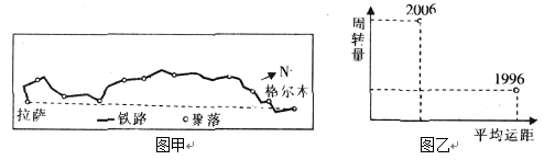 4、综合题 (24分)图甲是青藏铁路及沿线聚落。图乙是青藏铁路通车前后西藏自治区公路运输货运周转量及平均运距变化示意。读图回答问题。