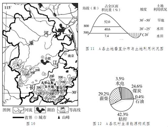 2、综合题 A县位于我国中部的安徽省西部地区,人口65万,土地面积3667平方千米,土层厚度约0.1米~0.8米之间,2009年粮食产量约56万吨。根据下列材料,结合所学知识,完成(1)~(4)题。