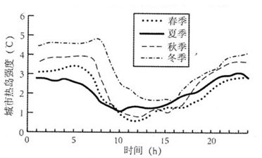A.春季丰富的降水降低了城市热岛强度 B.受上班人流、车流影响,各季节热岛强度在早上7时前后均达到高峰值 C.秋季多大风,城市热岛强度较小 D.冬季低温,人为释放热造成热岛效应最明显 |
