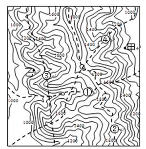 小题1:图中①、②、③、④四条虚线正确表示图中河流分水线的是