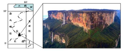4、综合题 (28分)分析图文资料,完成下列各题。下图中R山海拔2180米,具有顶平、坡陡、麓缓的外观特征。R山顶部长约14千米,宽约5千米,主要由砂岩构成;山下生气盎然,猴子的吱吱叫声和金刚鹦鹉的鸣声此起彼落,四周覆盖着棉花糖般的云,边缘攀爬着前所未见的热带植物,上百条瀑布飞溅,被誉为“瀑布之乡”。(1)据图描述R山的地理位置。(6分)(2)说出R山岩石类型、地质构造和构造地貌。(6分)(3)据图简述R山山顶的气温特点,并分析其形成原因。(10分) (4)从大气环流和地形角度简述R山被誉为“瀑布之乡”的原因。(6分)