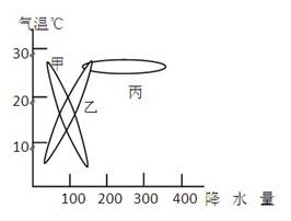 4、单选题 下图是根据甲、乙、丙三地各月平均气温和各月平均降水量所作的区间统计图,读图完成题。