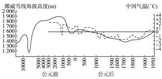 4、单选题 下图是“一万年来挪威雪线高度(实线)与五千年来中国温度(虚线)变迁”,完成问题。
