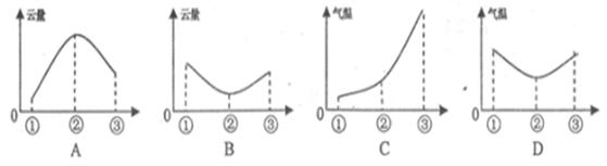 【小题1】②附近的虚线为低压槽。低压槽附近易形成锋面,呈阴雨天气,云量较大。槽线两侧,①处受冷气团控制,③处受暖气团控制,①—②—③气温依次升高。所以选择答案A.