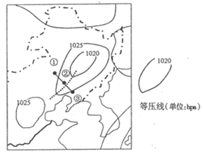【小题2】风由高压吹向低压,①处应该吹偏北风,A错。②处在低压槽附近,降水概率大,云量多,气温日较差小,B正确C错误。③处在外流区,河流参与海陆间循环,D错误。