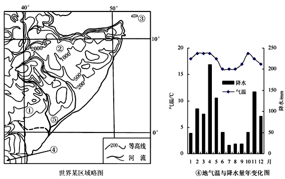 (3)气候特征的描述包括气温和降水两方面,从④地的气温和降水量变化图中可以看出该地全年高温,气温年较差小;年降水量较多,且季节变化明显。