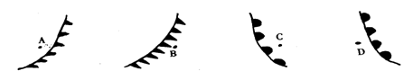 4、单选题 下列四幅冷暖锋移动示意图,A、B在高伟地区C、D在低位地区纬度位置和下垫面大致相同,图示此时气温最低是:( )