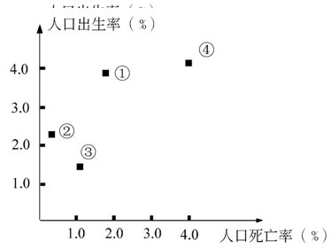 2、单选题 右图反映的是四个国家的人口出生率与死亡率,其中最能代表“现代人口增长模式”的国家是