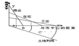 小题1:图示甲在市中心的付租能力最高,判断为中心商务区的商务办公楼;乙在市中心的付租能力仅次于甲,判断为商店,而丁在市中心的付租能力最低,随距市中心距离增加,付租能力的差异变化最小,故判断为工厂。