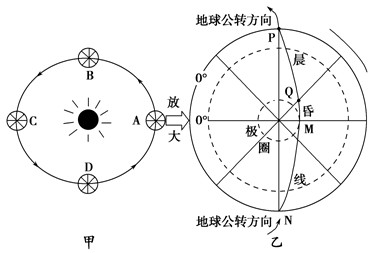 (1)在乙图中用不同的符号标出哪段是晨线、哪段是昏线;在乙图右上角粗线上画箭头表示地球的自转方向。